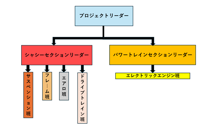 プロジェクトリーダーの統率の元、パワートレインセクション、シャシーセクションの大きく2つに分かれています。メンバーは所属する班にて担当と決まったパーツの責任者として、設計・製作・実装に取り組みます。
